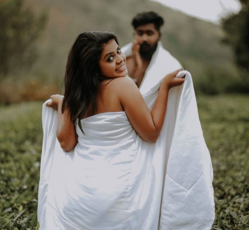 සමාජමාධ්යවල වෛරස් වූ ඡායාරූපවල දැක්වෙන්නේ සුදු සිල්ක් සළුවකින් සිය නිරුවත වසා ගත් තරුණ යුවළක් ( ලක්ෂි සහ භාෂි කාර්තික් Lekshmi and Hrushi Karthik ) තේ වත්තක ගත් සරාගී ඡායාරූප කිහිපයකි.