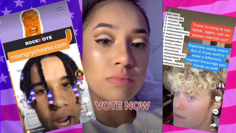 ‘Bigtent Creative’ සමාගමේ එක් වීඩියෝ නිර්මාණ මාලාවක් දේශපාලන පක්ෂග්රාහීභාවයෙන් තොරව ඡන්දදායකයන් ලියාපදිංචි කරවීමේ සම්බන්ධතාවක් නංවාලීමට අන්යෝන්ය ලෙස ක්රියාත්මක වෙන ප්රධාන දහරාවේ ටික්ටොක් ගිණුම් ගණනාවකට සහයෝගය දී ඇත. එහෙත් “vote chain” නම් එම සම්බන්ධතා ජාලයේ ඇතැම් ග්රාහකයන් පහත දැක්වෙන ආකාරයේ “ට්රම්ප් විරෝධී පණිවුඩ” ඊට එක්කරනු ලැබ ඇත.