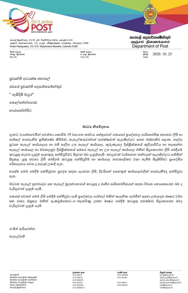 තැපැල්පති රංජිත් ආරියරත්න මහතා විසින් නිකුත් කළ මාධ්ය නිවේදනය සම්පූර්ණයෙන් පහත පළ වෙනවා.