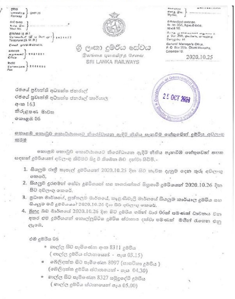 මේ අතර, කොළඹ කොටුව දුම්රිය ස්ථානය පිහිටි ප්‍රදේශයට ඇඳිරිනීතිය පනවා ඇති බැවින් ගාල්ල දක්වා ධාවනය වන රාත්‍රී තැපැල් දුම්රිය හැර කොළඹ කොටුවෙන් ආරම්භ වන සෙසු සියලු රාත්‍රී තැපැල් දුම්රිය ගමන්වාර අවලංගුකර ඇති බවයි දුම්රිය දෙපාර්තමේන්තුව දැනුම් දෙන්නේ.
