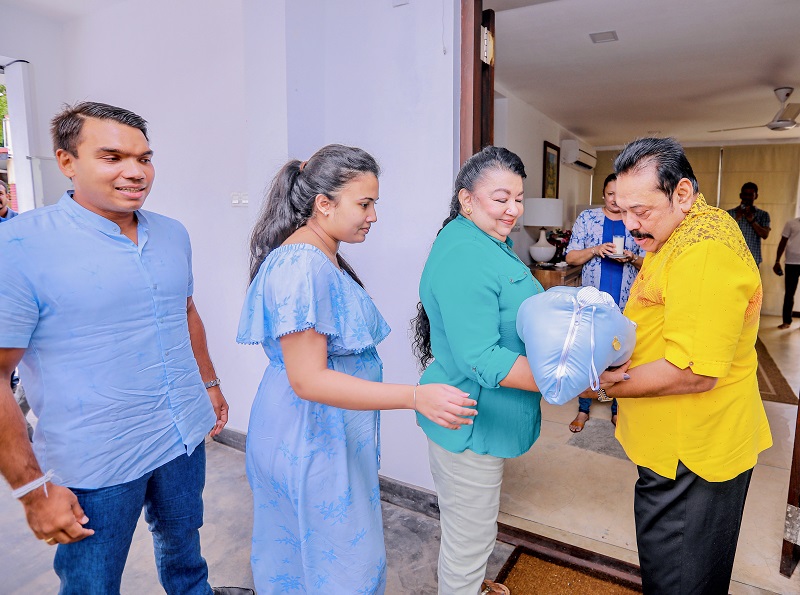 සිය මුණුබුරා දෑතින් ගත් අග්රාමාත්ය මහින්ද රාජපක්ෂ මහතා සුරතල් වදන් තෙපලමින් සිය මුණුබුරාගේ මුවට සිනහවක් කැන්දුවේය. සතුට ඉතිරෙන නව කැදැල්ලට පැමිණ සිටි සියලු දෙනා සුබ පැතූහ