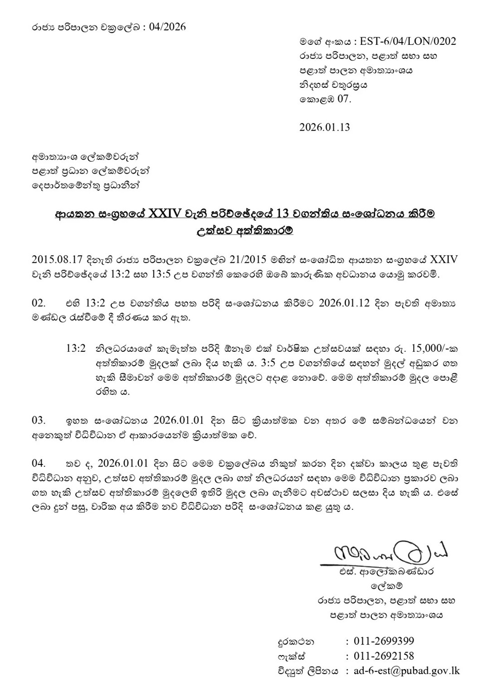 උත්සව අත්තිකාරම් සම්බන්ධයෙන් ආයතන සංග්‍රහයේ XXIV වැනි පරිච්ඡේදයේ 13 වගන්තිය සංශෝධනය කරමින් රාජ්‍ය පරිපාලන අමාත්‍යංශයෙන් චක්‍රලේඛයක් නිකුත් කර ඇත. එම චක්‍රලේඛය පහත දැක්වේ.