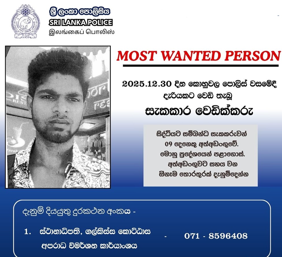 2025.12.30 වන දින කොහුවල පොලිස් වසමේ කළුබෝවිල, සරණංකාර පාර ප්රදේශයේදී වයස අවුරුදු 16 ක දැරියකට වෙඩි තබා තුවාල සිදුකළ සැකකාර වෙඩික්කරු විමර්ශන නිලධාරීන් විසින් හඳුනා ගෙන තිබේ. සැකකරු ප්රදේශයෙන් පළා ගොස් සැඟව සිටින බව අනාවරණය කරගෙන ඇති අතර මහජන සහය ලබාගෙන ඔහු අත්අඩංගුවට ගැනීම සඳහා පහතින් සැකකරුගේ ඡායාරූපයක් දක්වා ඇත. සැකකරුගේ විස්තර:- නම :- අරුමාදුර සමීර සිල්වා ජා:හැ:අ :- 900514018v …