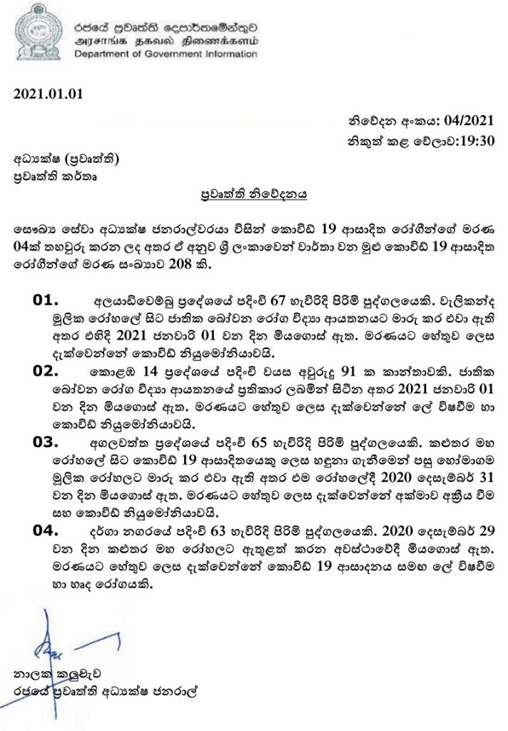 සෞඛ්ය සේවා අධ්යක්ෂ ජනරාල්වරයා විසින් කොවිඩ්-19 ආසාදිත රෝගීන්ගේ මරණ 04ක් තහවුරු කරන ලද අතර ඒ අනුව ශ්රී ලංකාවෙන් වාර්තා වන මුළු කොවිඩ්-19 ආසාදිත රෝගීන්ගේ මරණ සංඛ්යාව 208 දක්වා ඉහළ ගිය බව රජයේ ප්රවෘත්ති දෙපාර්තමේන්තුව විසින් අද (01) දින නිකුත් කළ මාධ්ය නිවේදනයක සදහන් වේ.