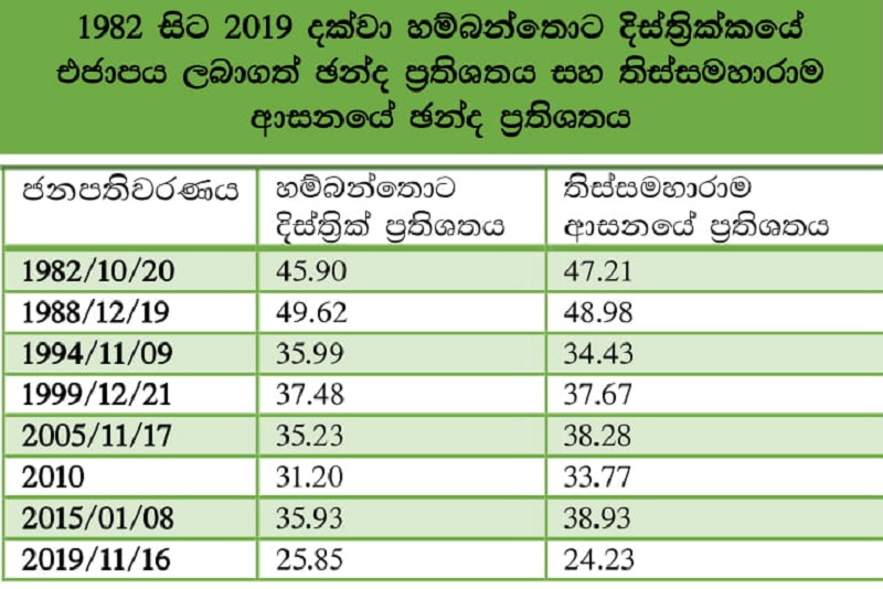 එහෙත් එකී සියලු නිරීක්ෂණ හා සජිත් ප්‍රේමදාස මහතා දශක දෙකක් ‘හම්බන්තොටට කළ බව කියන සුවිශාල සේවය ගඟට කැපූ ඉණි බවට’ ඊයේ පැවැති ජනාධිපතිවරණයේදී පත් විය. ඒ අනුව එක්සත් ජාතික පක්ෂයේ හෝ එහි සහාය ලැබූ අපේක්ෂකයෙක් 1982 සිට 2019 දක්වා පැවැති ජනාධිපතිවරණ 07 දී හම්බන්තොටින් වාර්තා කළ අවම ඡන්ද ප්‍රතිශතය වූ සියයට 25.85ක් ද තිස්සමහාරාමයෙන් එජාපය වාර්තා කළ අවම ඡන්ද ප්‍රතිශතය වූ සියයට 24.23ක අගය මෙවර සජිත් ප්‍රේමදාස මහතා විසින් වාර්තා කිරීම විශේෂත්වයකි.