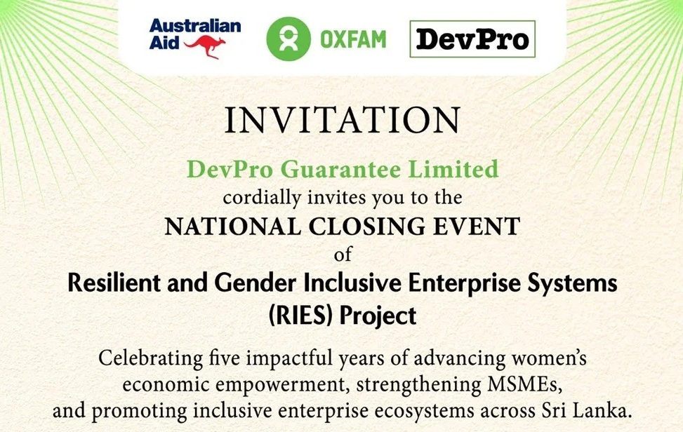 ඕස්ට්‍රේලියානු රජයේ අරමුදල් යටතේ ක්‍රියාත්මක වන ප්‍රතිරෝධී සහ ස්ත්‍රී පුරුෂ භාවය ඇතුළත් ආර්ථික පද්ධති (Resilient and Gender Inclusive Economic SystemsRIES)’ ව්‍යාපෘතියේ ජාතික සමාප්ති උත්සවය 2025 ජුනි 19 වන බ්‍රහස්පතින්දා පෙ.ව. 9 ට කොළඹ ගෝල් ෆේස් හෝටලයේදී පැවැත්වීමට නියමිතය.